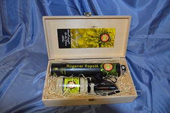 Bestes Rügener Rapsöl zusammen mit köstlichem Rügener Rapshonig und einer wirkungsvollen Lippenpflege (mit Rügener Rapsöl) in einer hochwertigen Geschenkverpackung.