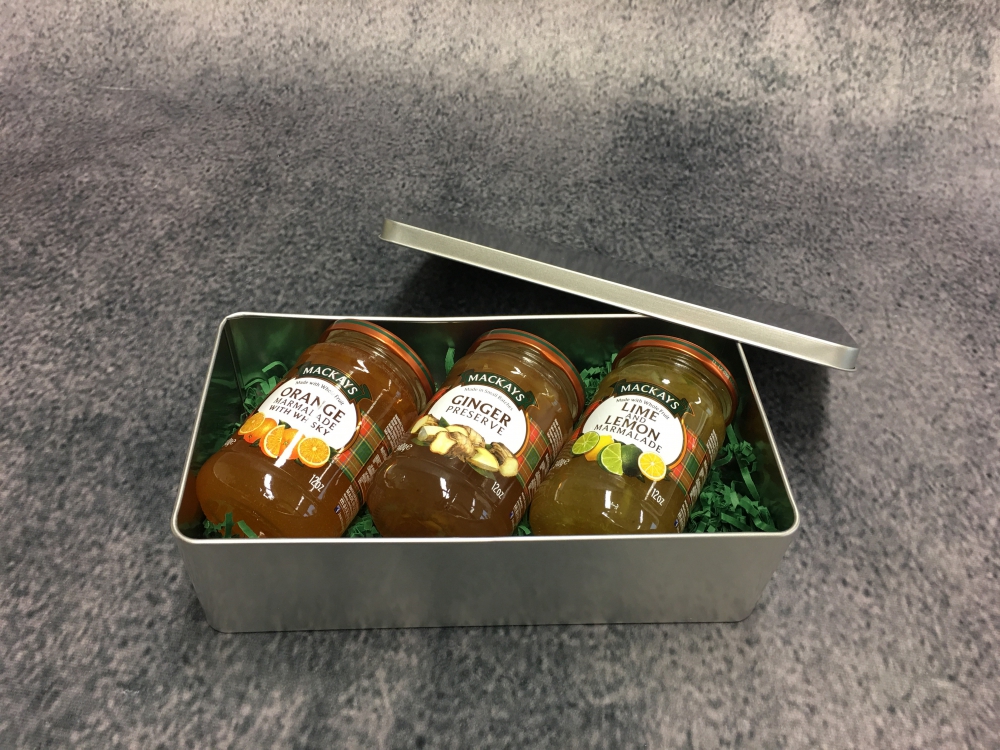 Stollendose gefüllt mit drei englischen Frühstücks-Spezialitäten von MACKAYS