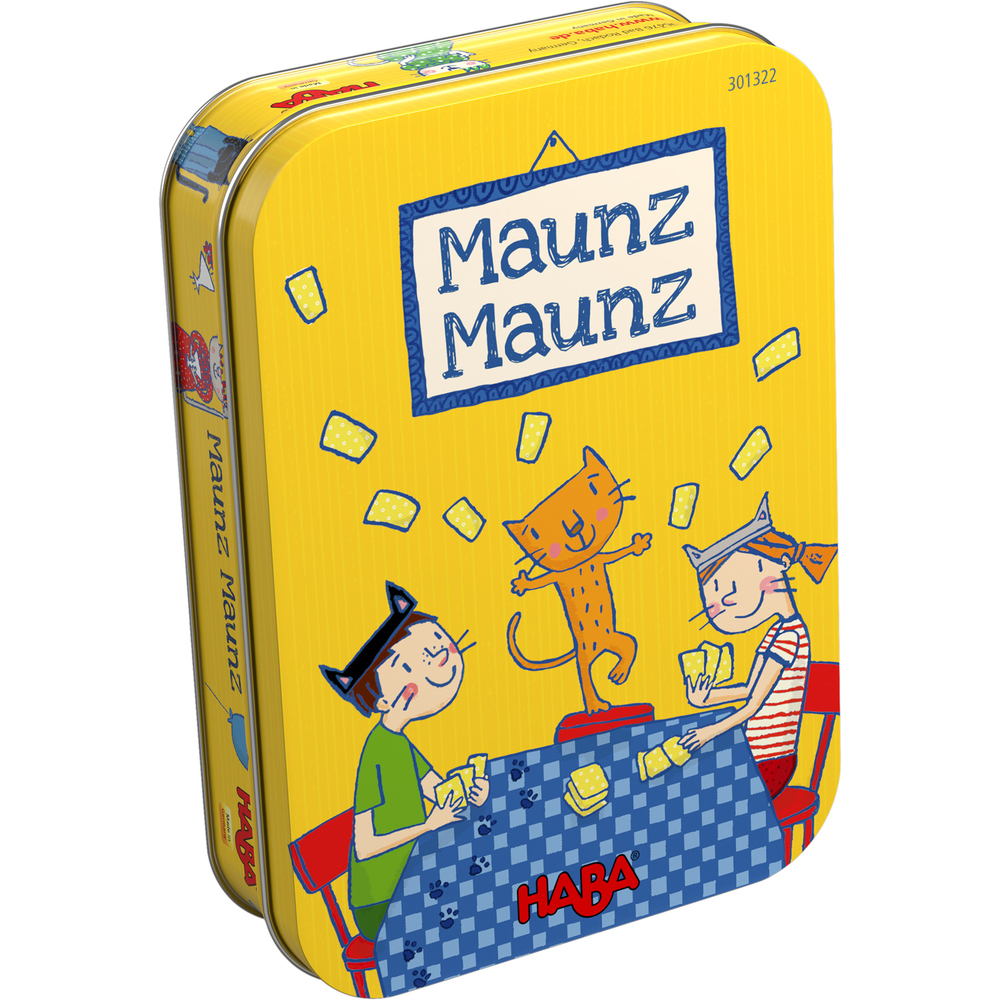 Auf die Pfoten, fertig, maunz! Mit dem lustigen HABA-Kartenspiel sind die süßen Maunz-Katzen los und bringen kunterbunten Spielspaß für die ganze Familie. Mit Glück und etwas taktischem Geschick kann man zuerst alle seine Karten ablegen und bekommt eine kleine Holz-Katze. Wer als erster zwei Holz-Katzen gesammelt hat, gewinnt das kunterbunte Kartenspiel. Die einfachen Spielregeln bieten viel Spaß für alle Katzenfans ab 5 Jahren. Maunz Maunz, der lustige HABA-Kartenspiel-Klassiker in der praktischen Metalldose, ist ideal zum Mitnehmen und die liebevoll illustrierten Spielkarten erfreuen jeden Katzenfan.