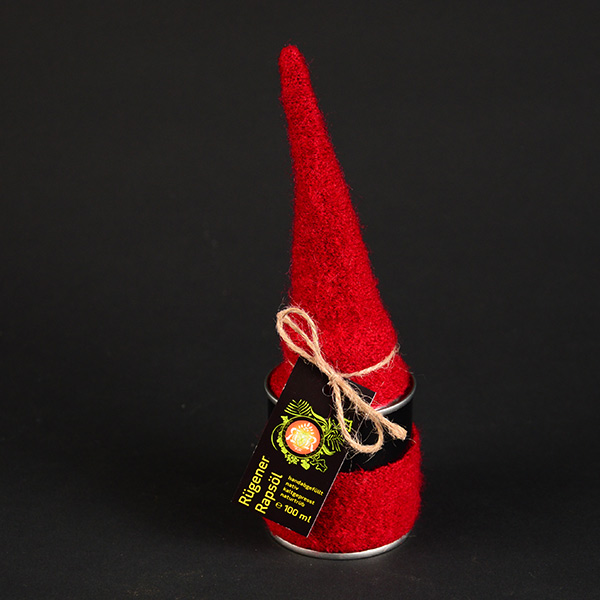 100 ml Rügener Rapsöl in der Weißblechdose, verkleidet als Weihnachtszwerg