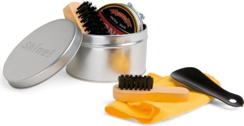 Schuhputz-Set 5-teilig in der Weißblechdose, Schuhanzieher, 2 Schuhbürsten, Tuch und Schuhcreme.