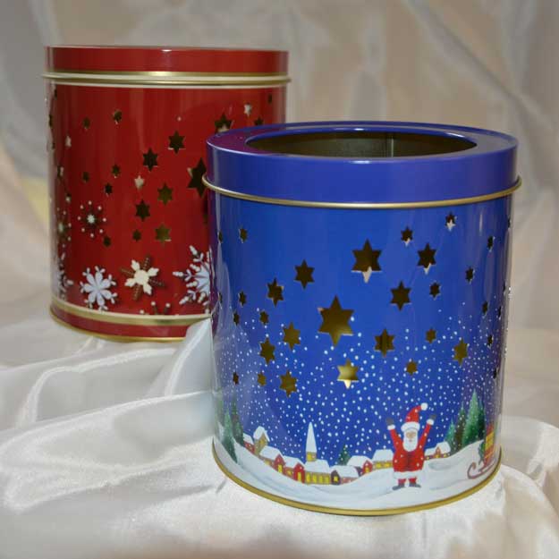 Runde Stüpdeckeldose mit Motivdruck und ausgestanzten Sternen 110mm x 120mm