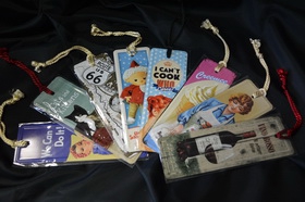 Gewölbt und randgeprägt, mit Kordel und papierbeschichteter Rückseite, Größe: 5 x 15 cm. Verschiedene Motive.