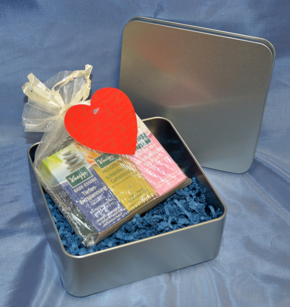 Weißblechdose, 150 x 150 x 55 mm, gefüllt mit 3 x 20 ml Kneipp Badeöle